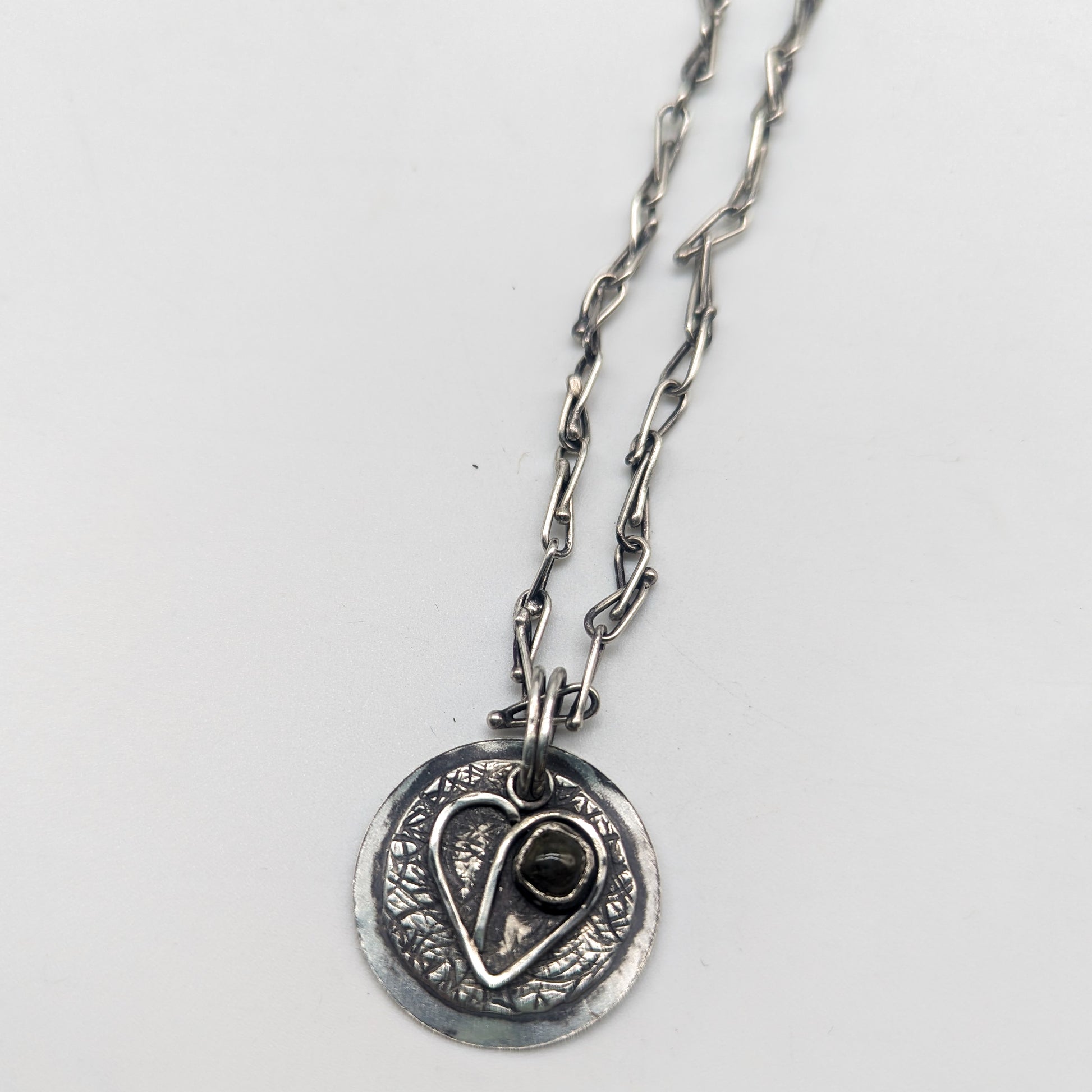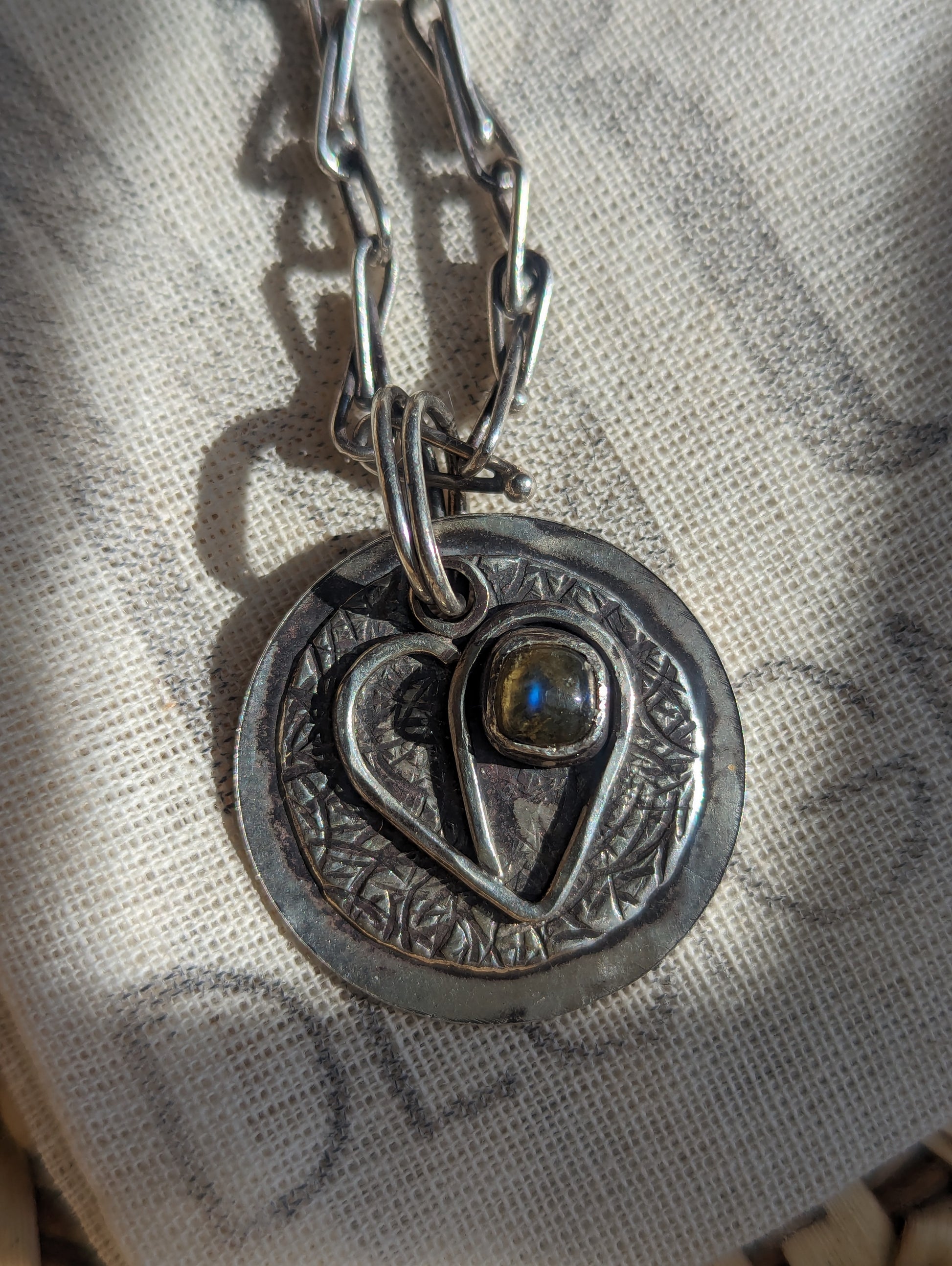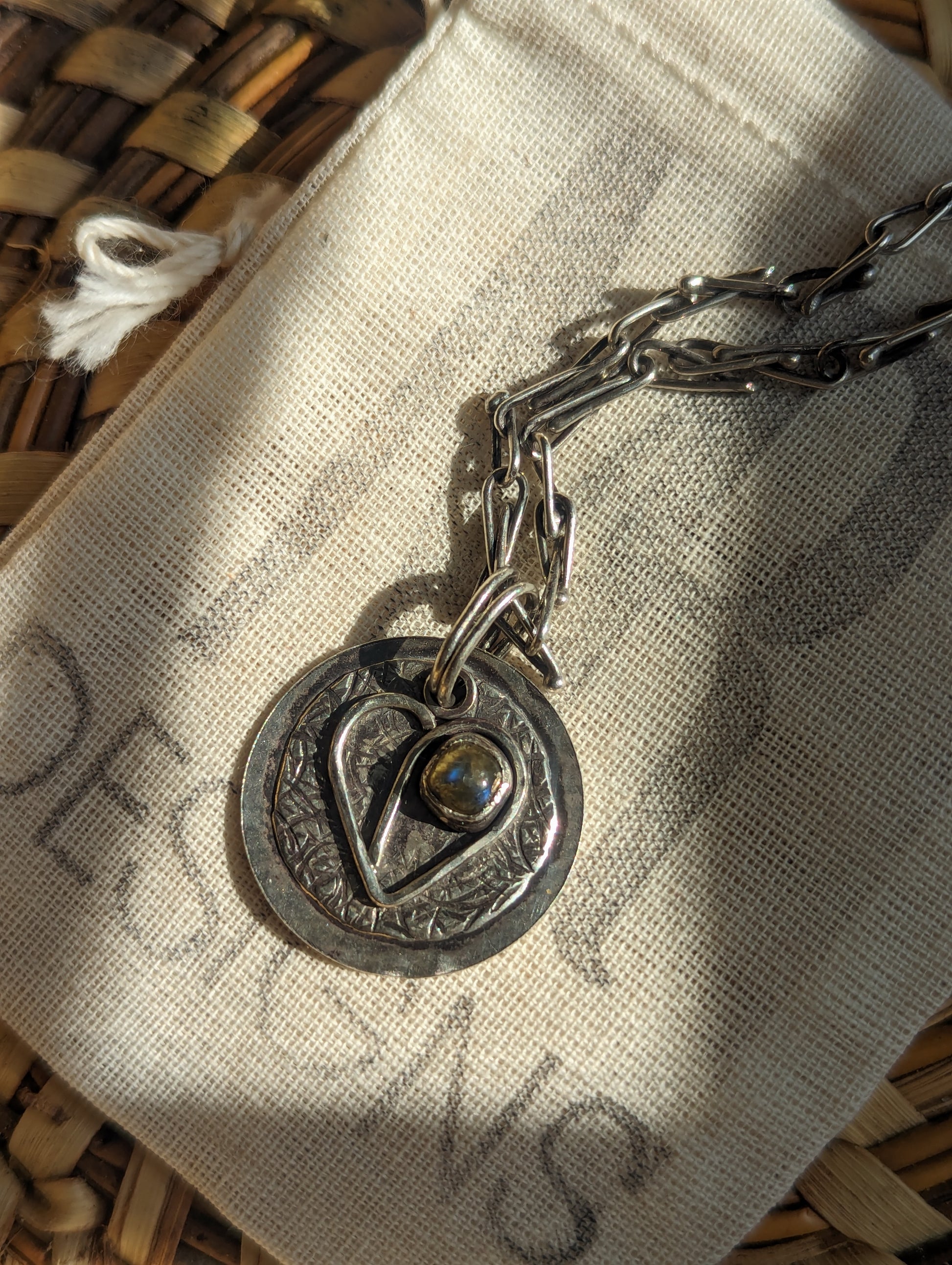 Two chambered heart in 2 textured plates. Hammered and soldered. Slow-made. Labradorite stones.