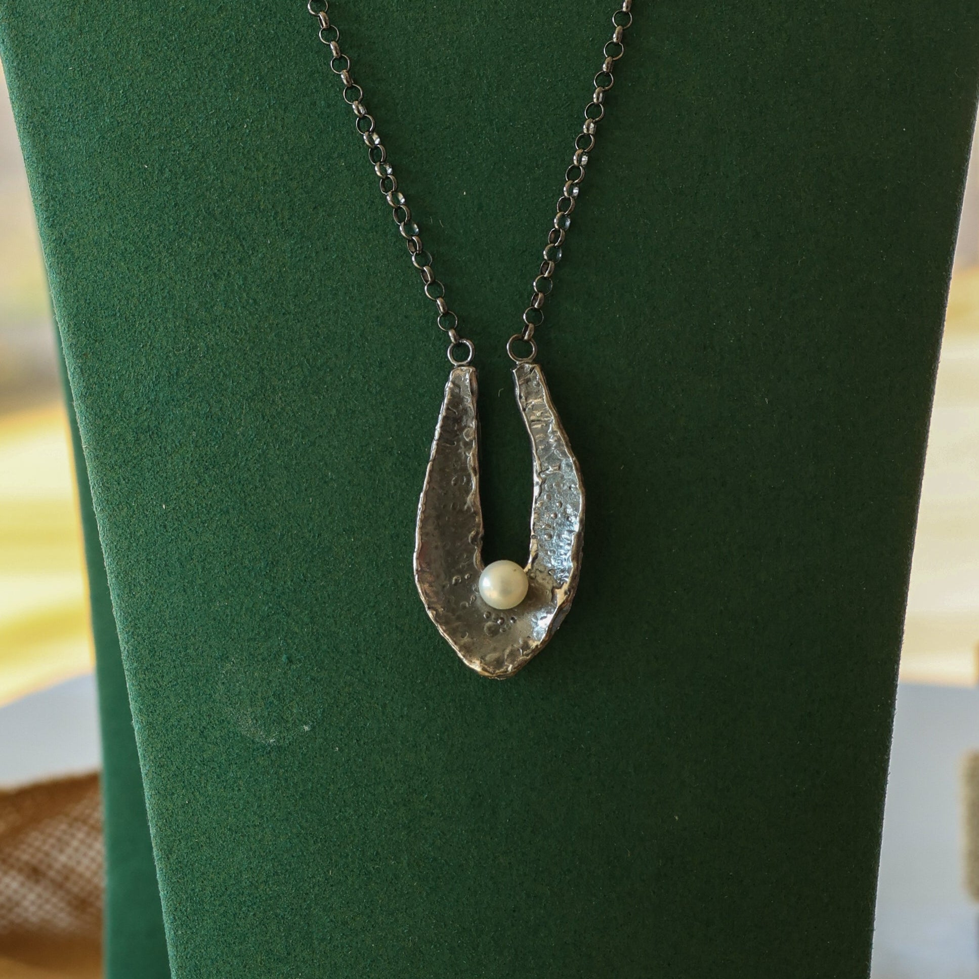 Freshwater white pearl. Oxidized Sterling design and chain.