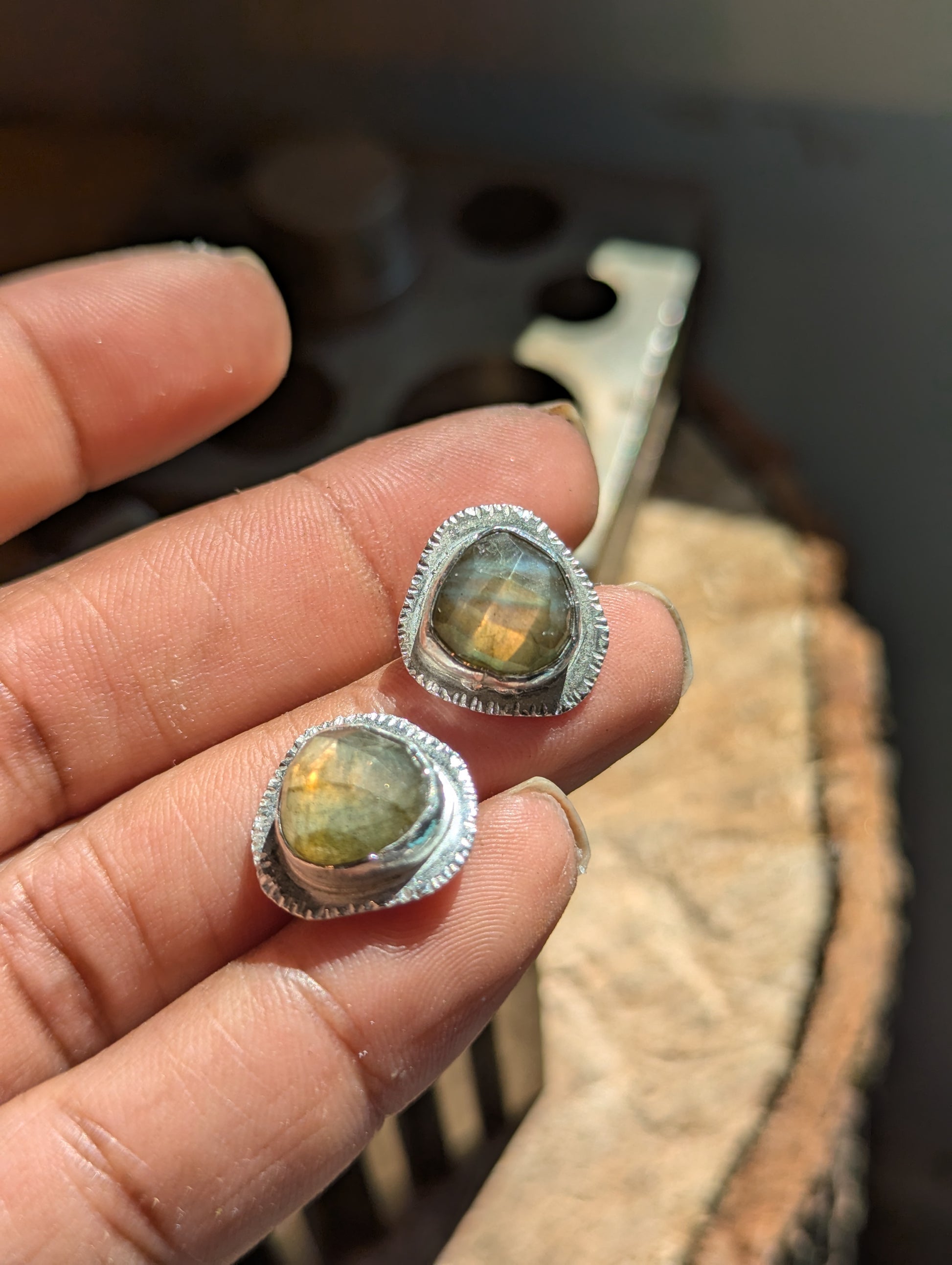 Labradorite stones set on abstract-shaped back plates. The amber flashed from the labradorite, offering a two-toned/mixed metal hinting at gold and silver.